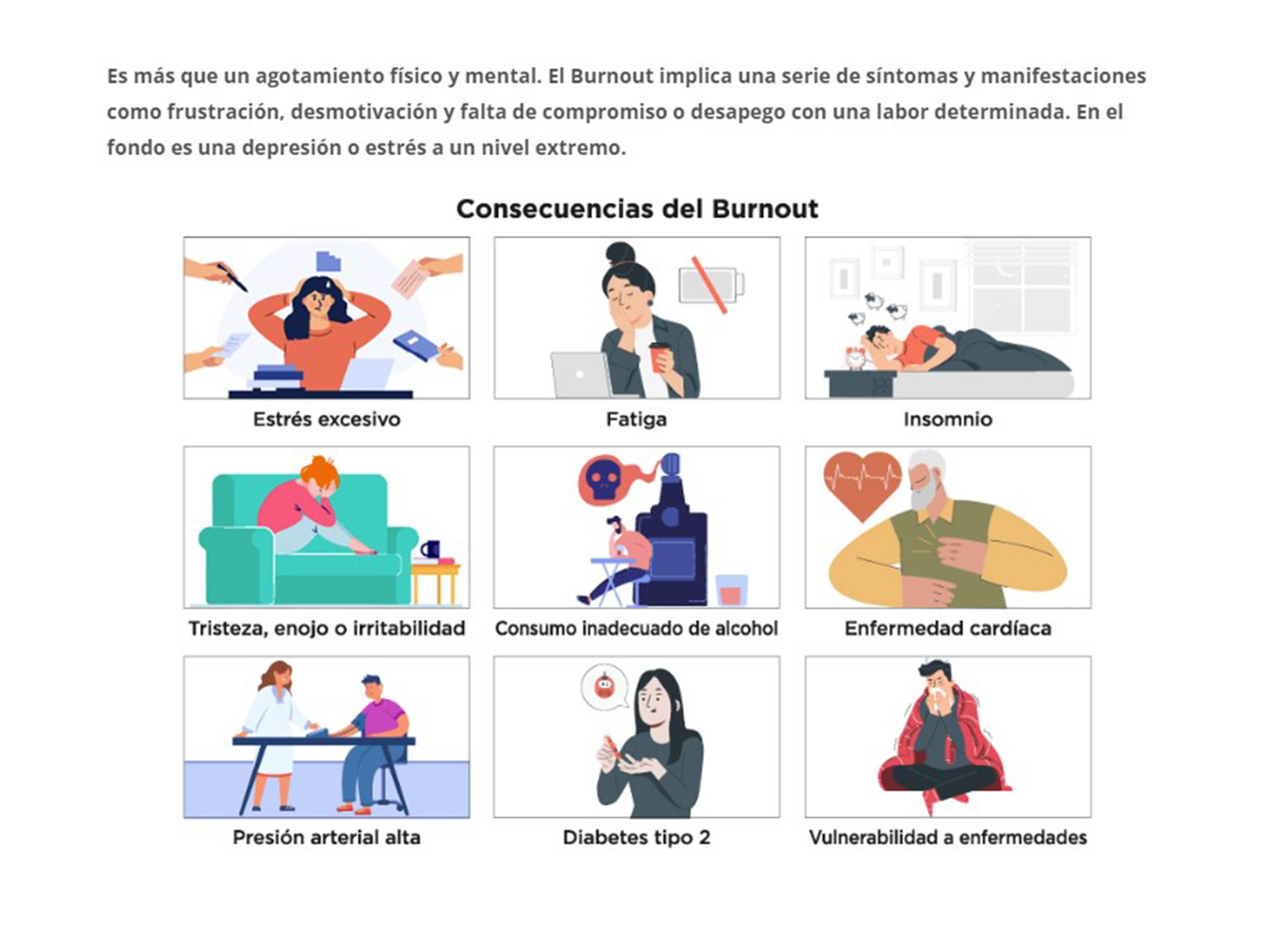La también terapeuta detalló que el síndrome tiene tres componentes: cansancio o agotamiento emocional (sin ganas, desmotivado); despersonalización (construcción inconsciente de una defensa para protegerse de la impotencia, indefinición, frustración y conflictos, que se manifiesta en una desconexión o robotización en el trabajo); y el abandono de la realización personal, cuando se pierde el valor que el propio trabajo tenía para la persona, lo cual lleva a la ley del mínimo esfuerzo, es decir, “hacen como que me pagan, y yo hago como que trabajo”, por ejemplo, y esto afecta a las instituciones.