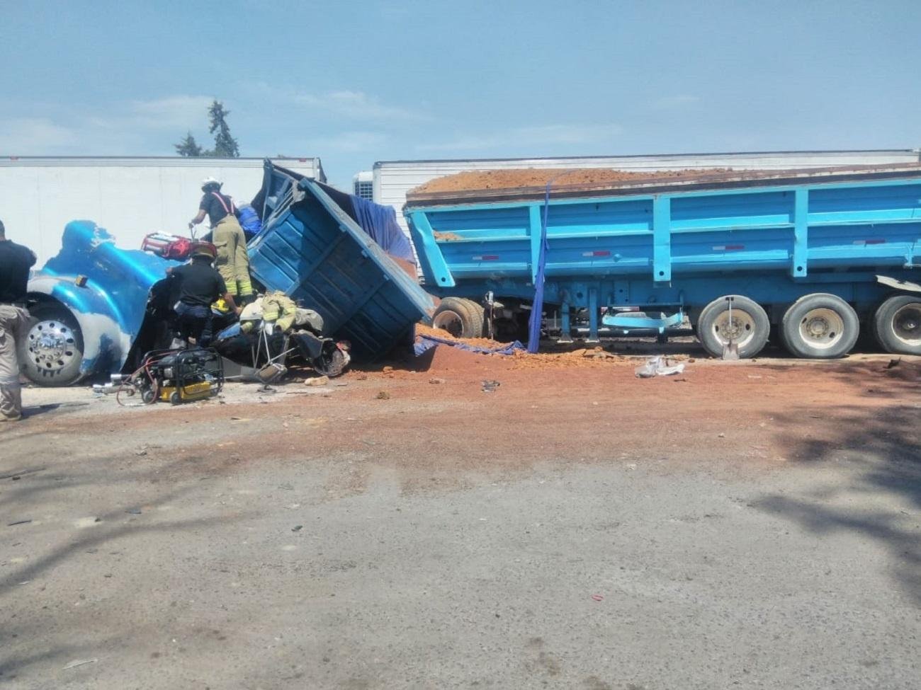 De acuerdo con testimonio del operador del tráiler marca Kenword color azul, modelo 1991, tipo góndola con placas de circulación 38AF1F Pascual “N”, la pesada unidad se quedo sin frenos por lo que se impactó de frente con camión marca Kenword tipo volteo con placas de circulación 695DW5 de color azul.