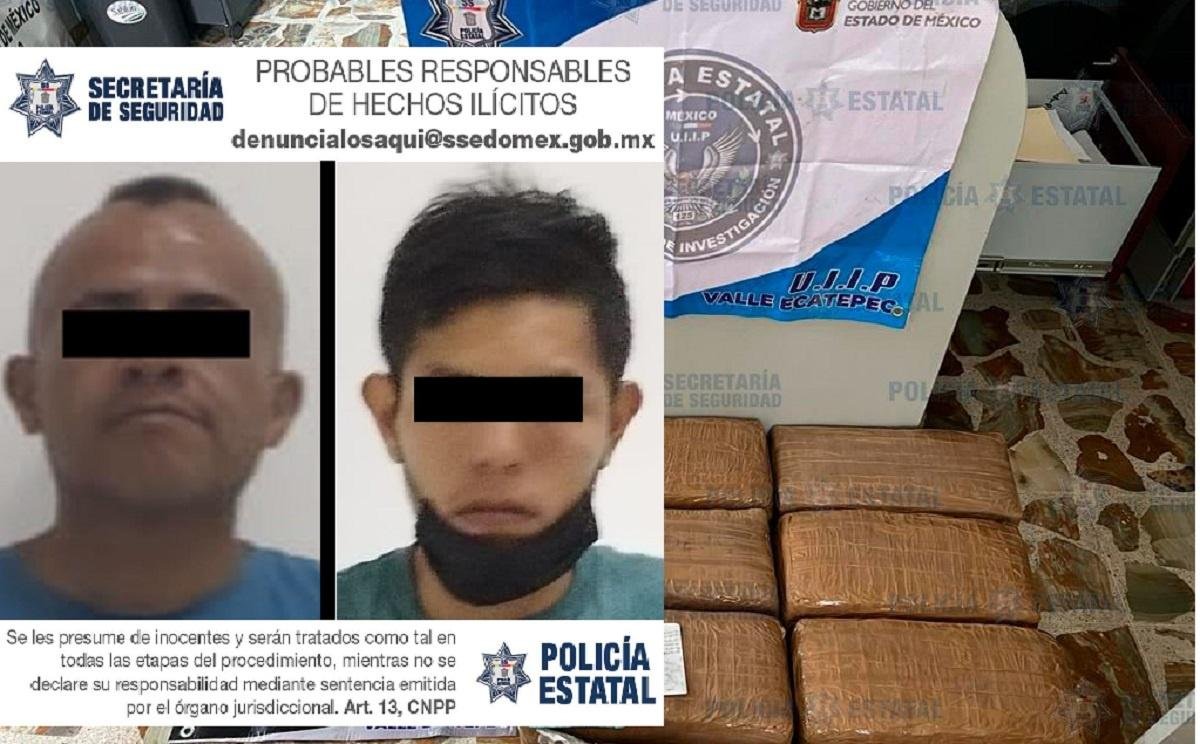 Acolman, Estado de México. - Trabajos de investigación en campo permitieron que elementos de la Secretaría de Seguridad (SS) detuvieran a dos hombres, probables implicados en delitos contra la salud en la modalidad de narcomenudeo; en la acción, decomisaron aproximadamente 24 kilogramos de hierba verde y seca con características propias de posible marihuana, además de empaques con dosis de aparente cocaína en piedra y cristal.